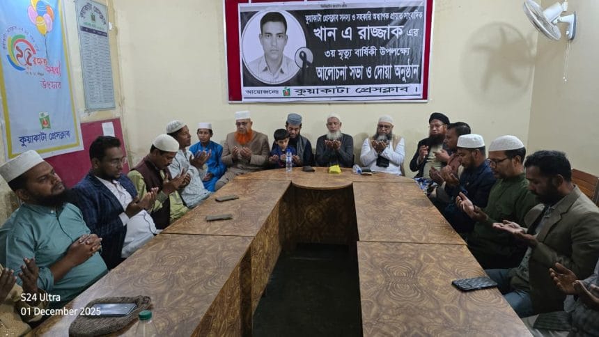 দৈনিক সমকালের কুয়াকাটা প্রতিনিধি, কুয়াকাটা প্রেসক্লাবের সদস্য ও খানাবাদ কলেজের সহকারী অধ্যাপক প্রয়াত খান এ রাজ্জাকের তৃতীয় মৃত্যুবার্ষিকী উপলক্ষে আলোচনা সভা ও দোয়া মাহফিল অনুষ্ঠিত হয়েছে।