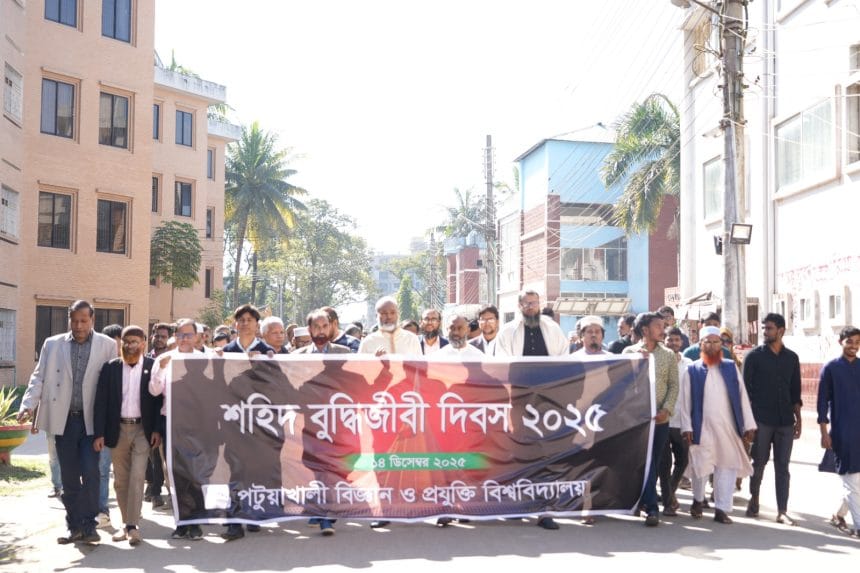 পটুয়াখালী বিজ্ঞান ও প্রযুক্তি বিশ্ববিদ্যালয়ে (পবিপ্রবি) যথাযোগ্য মর্যাদা ও গভীর শ্রদ্ধার সঙ্গে শহীদ বুদ্ধিজীবী দিবস পালন করা হয়েছে।দিবসটি উপলক্ষে রবিবার সকাল ১০টায় বিশ্ববিদ্যালয়ের প্রশাসনিক ভবনের সম্মুখে জাতীয় পতাকা অর্ধনমিতকরণ ও কালো পতাকা উত্তোলন করা হয়। এ সময় জাতীয় পতাকা অর্ধনমিত করেন বিশ্ববিদ্যালয়ের মাননীয় ভাইস-চ্যান্সেলর প্রফেসর ড. কাজী রফিকুল ইসলাম এবং কালো পতাকা উত্তোলন করেন প্রো-ভাইস চ্যান্সেলর প্রফেসর ড. এস. এম. হেমায়েত জাহান।