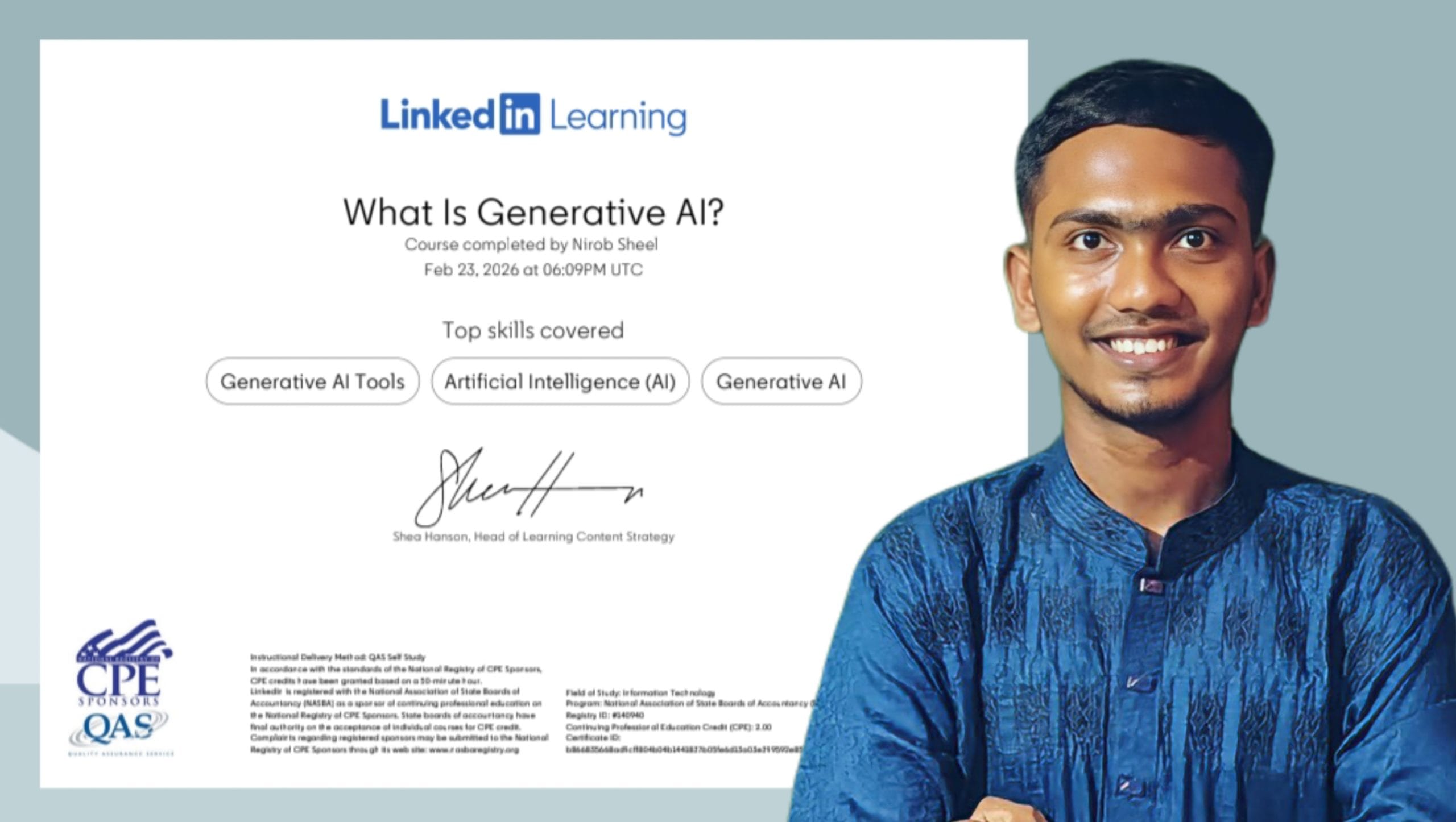 বিশ্বখ্যাত পেশাদার নেটওয়ার্কিং প্ল্যাটফর্ম LinkedIn-এ চালু হওয়া বিশেষ কোর্স “What Is Generative AI?” সফলভাবে সম্পন্ন করেছেন তিনি। কোর্সটির প্রশিক্ষক ছিলেন তুর্কি-কানাডীয় প্রখ্যাত কনটেন্ট নির্মাতা Pinar Seyhan Demirdag, যিনি চলচ্চিত্র নির্মাণে জেনারেটিভ এআই টুল উদ্ভাবনকারী প্রতিষ্ঠান Cuebric AI-এর প্রধান নির্বাহী কর্মকর্তা (সিইও)।