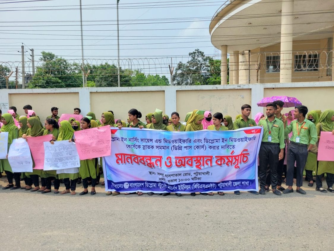 নার্সিং শিক্ষার্থীদের স্নাতক সমমানের দাবিতে পটুয়াখালীতে মানববন্ধন